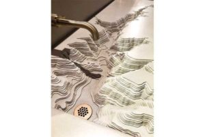 If glass is too delicate for your taste, how about a concrete sink. True Form Concrete makes an interesting sink that can be mounted on one of their stands or installed floating on wall. It comes in many different styles and also colors (if you don’t get too wild – this is concrete)! Their website is trueformconcrete.com. But talk about wild: Trueform also does custom work as seen in this “Canyon Sink” that was on display at the show!